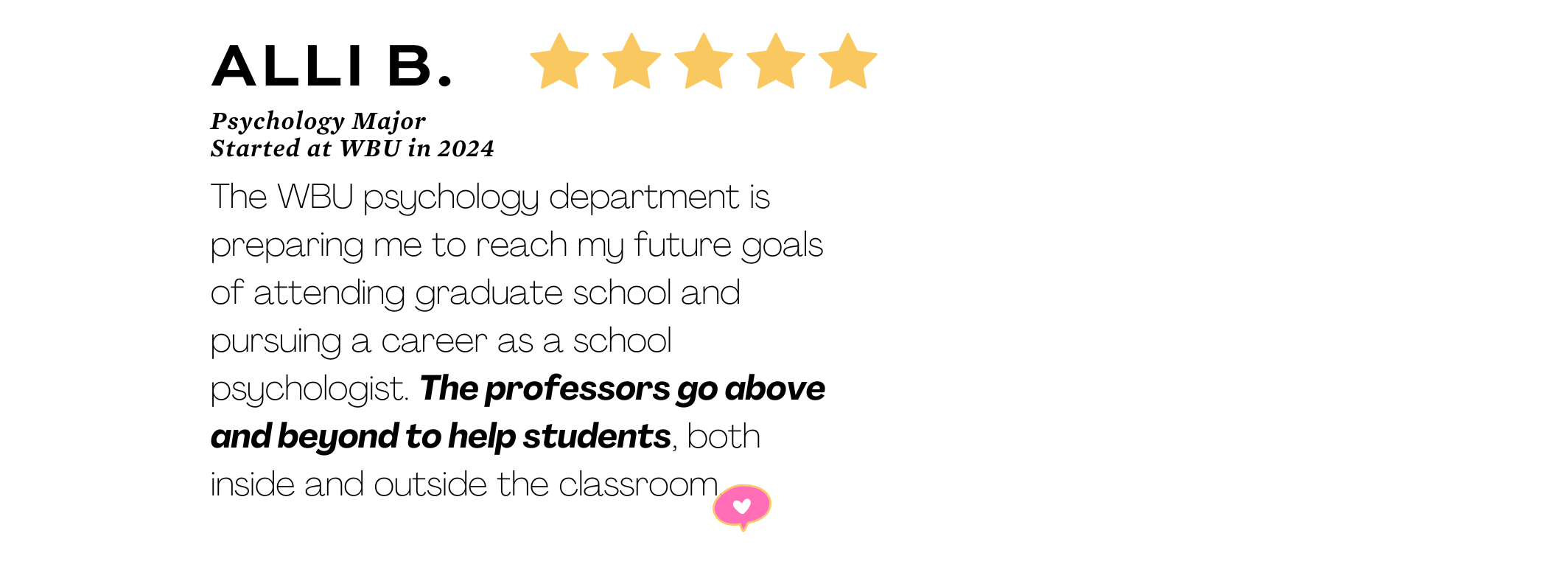 “The professors at WBU are truly one of a kind; nowhere else will you find professors willing to help both inside and outside the classroom, assisting all students to achieve their goals.”